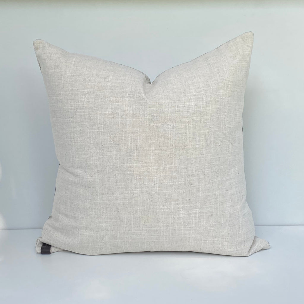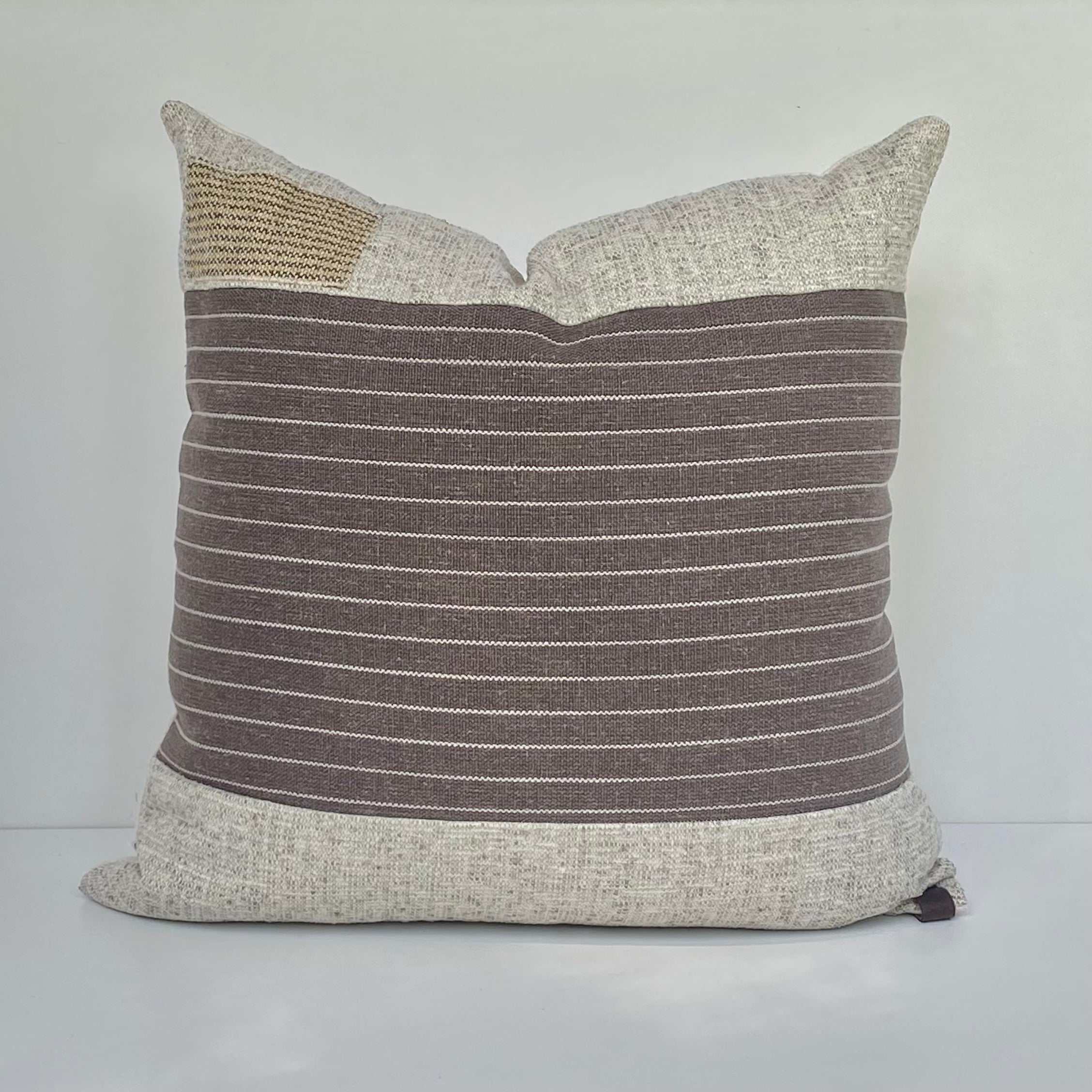 This 22" x 22" pillow features a sophisticated neutral palette blending brown with striped accents and grey fabric enhanced by a rustic striped patch. Complete with a distinctive leather finger loop for, it offers style and elegance to complement a range of interior decors.