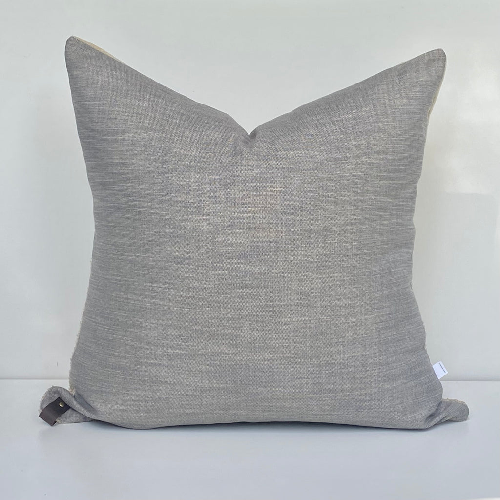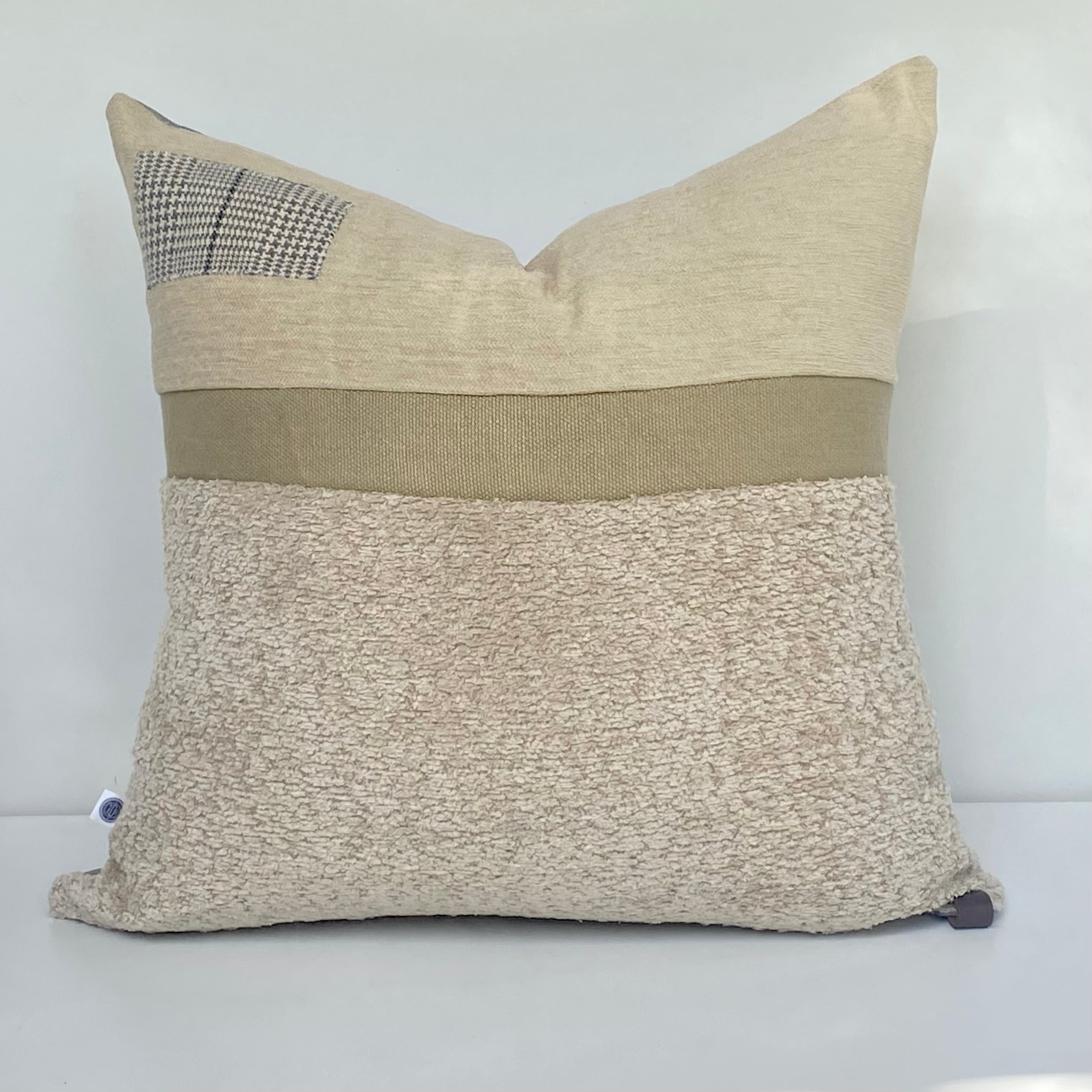 This 22" x 22" pillow features a plush cream fabric as its base, accented by a band of golden sage fabric and a section of downy ivory fabric with a blue plaid accent patch. The carefully chosen textures and neutral tones provide a balanced, tactile appeal, offering a sophisticated yet cozy accent to enhance the ambiance and comfort of any living space.